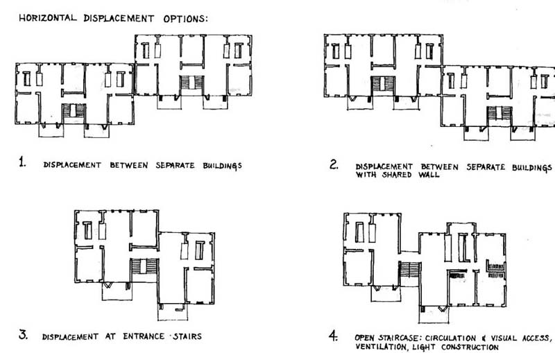 We achieved flexibility in plan through a series of horizontal displacements none of which required extensive changes in the construction system and some of which did not require any change (see figure below). These included displacements between separate buildings, at a common wall, and at the stairwell between apartments. We also introduced a new stair arrangement (using primarily existing components) with a much lighter and open stair which provided ready access between the front and back of the building as well as a flow of light, air, and visual access. |