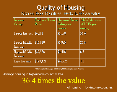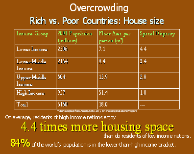 According to the UN Habitat 30% of the world’s urban population lives in slums, deplorable conditions where people suffer from one or more of the following basic deficiencies in their housing: lack of access to improved water; lack of access to improved sewage facilities (not even an outhouse); living in overcrowded conditions; living in buildings that are structurally unsound; or living in a situation with no security of tenure (that is, without legal rights to be where they are, as renters or as owners). 35% of the world’s rural population lives in unacceptable conditions. Overall more than 2 Billion people are in desperate need of better housing. In this poor housing people face many unmet needs. For example many are living in overcrowded conditions with inadequate living space. According to the World Bank & UN-Habitat Housing Indicators Program2, people in high income countries, such as Spain, have more than 4 times as much space per person as people in low income countries. (The differential with the U.S. is even higher.) 2. Housing Indicators Program. 1994 The Global Survey of Housing Indicators - 1990. Final survey results. Unpublished. Joint Program of the World Bank and the U.N. Centre for Human Settlements (Habitat). Washington, D.C: World Bank. Cited in “Housing Policy Matters, A Global Analysis”, Shlomo Angel, Oxford University Press. 2000. These people don’t have much space, but what they have is often of poor quality. How big is the difference in quality? And what would it take to bring that housing up to our standards? The Housing Indicators Program attempted to assign a dollar value to housing based on the amount and quality of housing provided. This is not the market value, but a reflection of the amenity provided. Housing in high income countries had 36 times the value, based on quality, of housing in low income countries. |