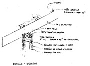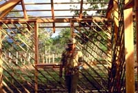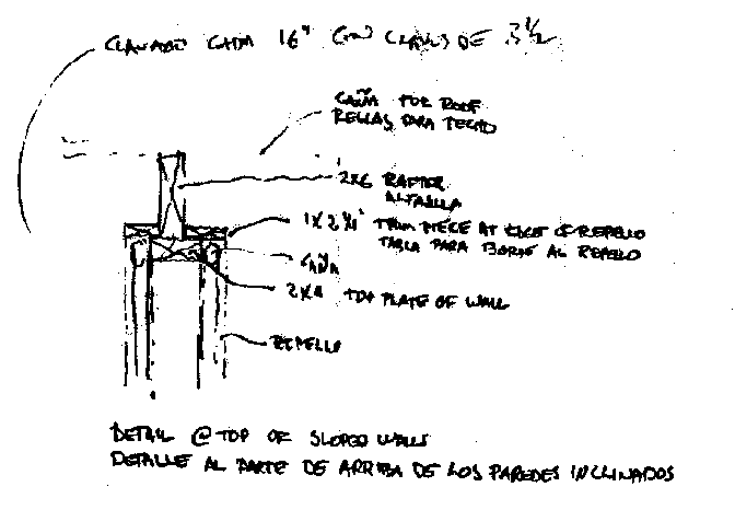 The walls are made from wood posts set on a 2"X4" sole plate. The posts are 4"X4" (3.5"X3.5" net) where they stand alone and at corners and intersections. Inside of walls 2"X4"s are used. The walls are enclosed on their face with caña castilla placed diagonally (approximately 45 degrees) and spaced at 6" o.c. The space between the caña is filled with mud and stones. The mud is made from carefully selected soil that will minimize shrinkage and produce a hard outer surface. The wall is then