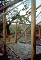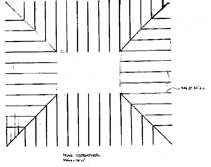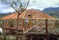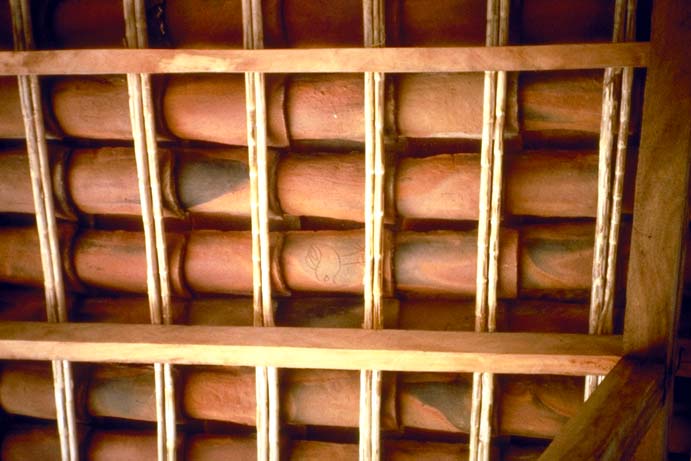 Roof framing is of wood rafters with caña castilla placed on top of the rafters to support fired clay tiles. Two pieces of caña are placed side by side and the pairs are set in at 12" on center coinciding with the distance required to support the clay tile.