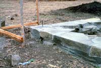The foundation is of stone using mud mortar up to the level of the natural grade. From natural grade up to a point 6" below the top of the footing no mortar is used. The top 6" is set with cement mortar.