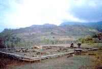 The area is then filled with stone and sand up to about 6" below finish floor level. 3" more of fine sand is placed on top of the stone sand mixture and then the flat floor stones are laid onto the sand. Finally (where budget allows) cement mortar is placed between the stones. Excess mortar is washed off the face of the stones leaving a clean border on each stone.