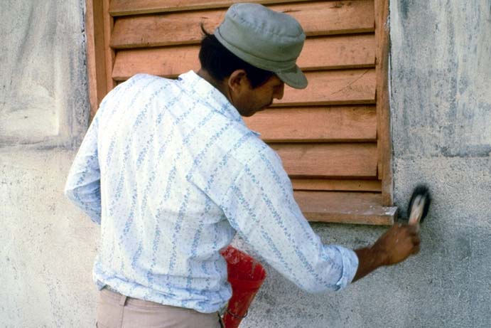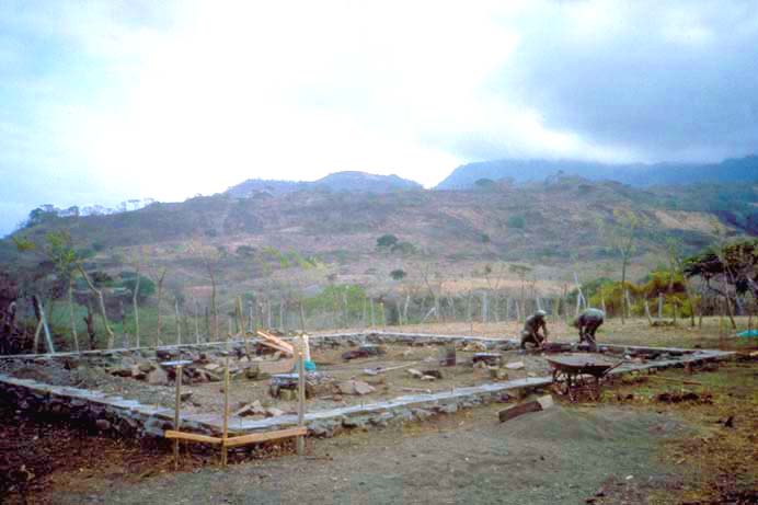 The exterior surfaces of the wall are weathered by the rain and must be whitewashed periodically. This wear is minimized by providing broad roof overhangs. The bottom portion of the wall is most exposed and in existing buildings is seen to be the most weathered part of the wall. Also, in the interior, mopping of the floors erodes the bottom few inches of the wall. As a result we have tried several alternatives for protecting this portion of the wall: 1) Inlaying stone in the bottom 6" of the wall surface, 2) using cement mortar for the finish coat at the bottom of the wall. Since cement does not adhere well to the earth, we expect this later method to be less