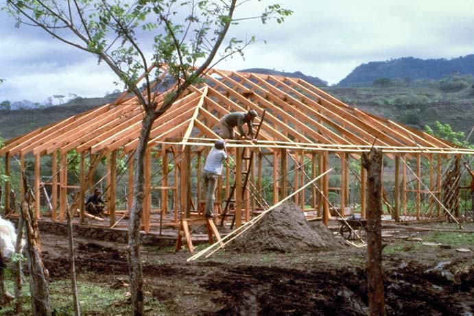 All lumber was produced by the coop members. They cut the trees, slabbed them with a chain saw. Initially the chain saw was used without a guide. Later we introduced a guide which helped produce more uniform cuts but also slowed production. The large slabs were then ripped to width using an electric circular saw. This is very fast and with a ripping guide produces very uniform cuts. Given current costs of equipment and labor, this method is much more economical than lumber produced in large mills.